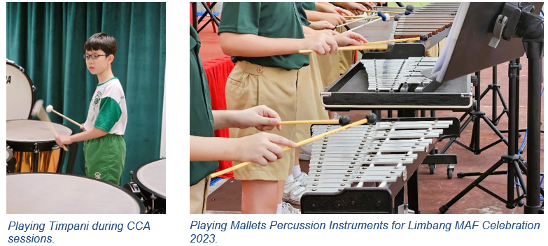 De La Salle School Percussion Ensemble, established in 2021, offers students a dynamic platform to explore percussion music while developing character and teamwork. Members learn to play a variety of instruments such as the xylophone, marimba, timpani, and drums, alongside basic music theory. The CCA emphasizes ensemble playing and sectional training, which fosters discipline, collaboration, and confidence. Values like respect, responsibility, and resilience are also cultivated through regular training and performance. Since 2022, the ensemble has actively participated in the Singapore Youth Festival (SYF), gaining authentic learning experiences. In 2024, their performance of “Again” at the Singapore Conference Hall showcased their growth and passion. Through meaningful school and public performances, percussionists experience the joy of music-making and a strong sense of belonging.